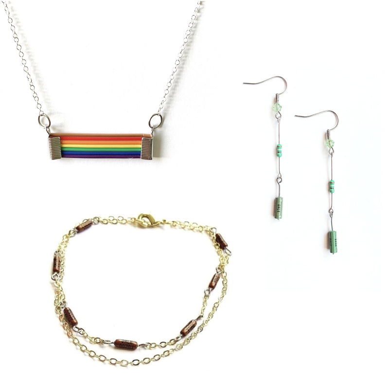 Colorful and minimalistic jewelry made using electronic and hardware components